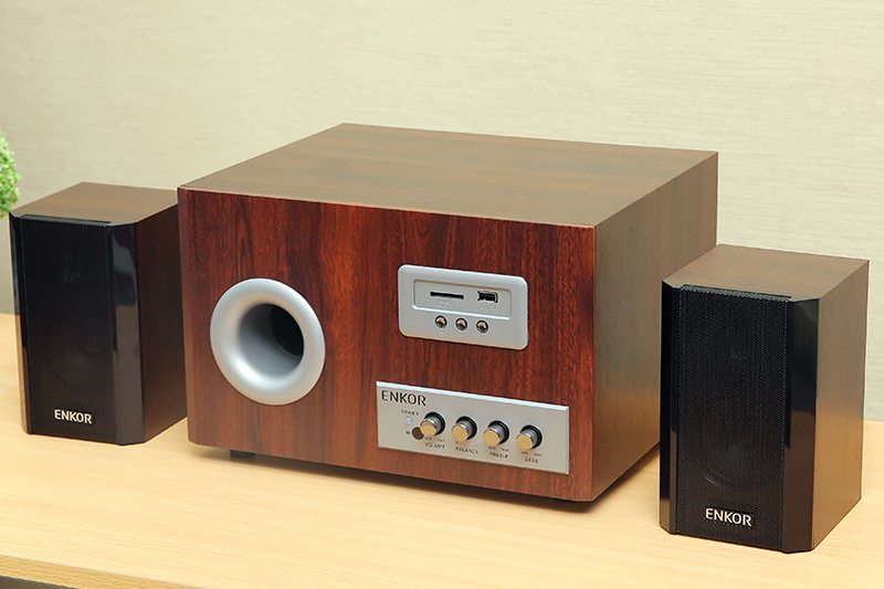 Loa máy tính Enkor với thiết kế cổ điển pha trộn hiện đại với màu nâu của gỗ, tạo sự sang trọng, nổi bật cho không gian bố trí loa