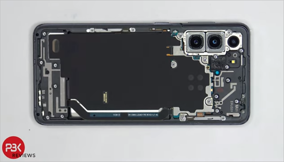 Bỏ tấm graphite ra sẽ thấy 2 ăng-ten mmWave 5G, một cải tiến so với Galaxy S20 chỉ có 1 ăng-ten. Galaxy S21 cũng có một cải tiến khác là hệ thống làm mát bằng than chì, thay vì ống đồng và buồng hơi của Galaxy S20.